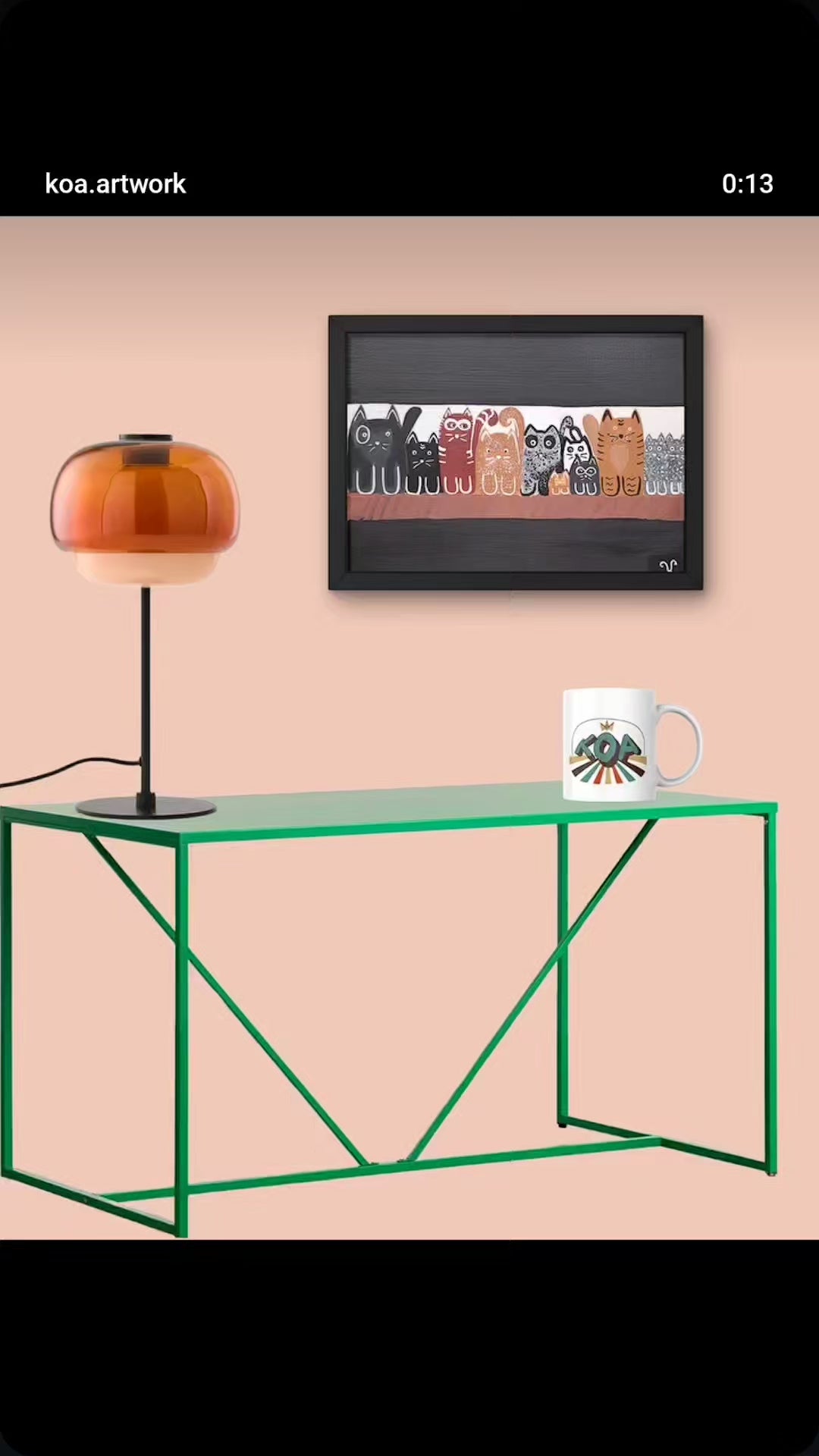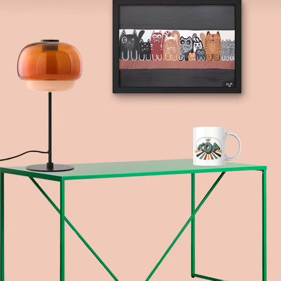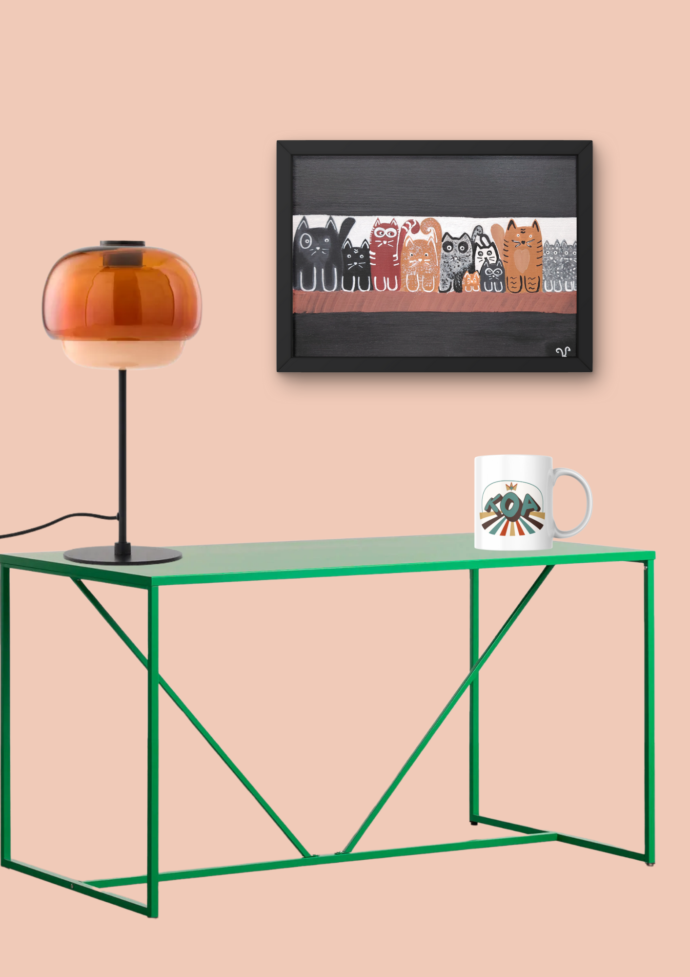 Les chats, aux couleurs presques réalistes (gris, ocre, bordeaux), sont alignés dans un ensemble harmonieux.
