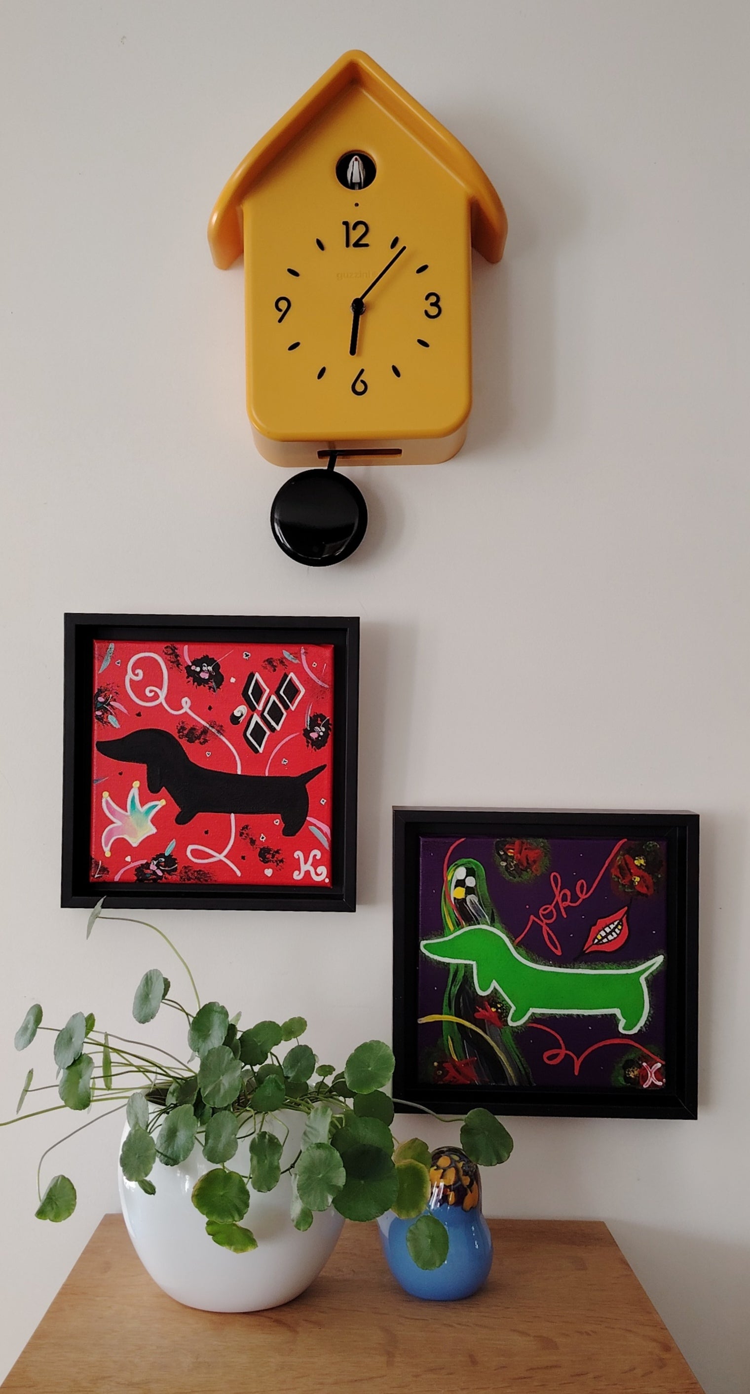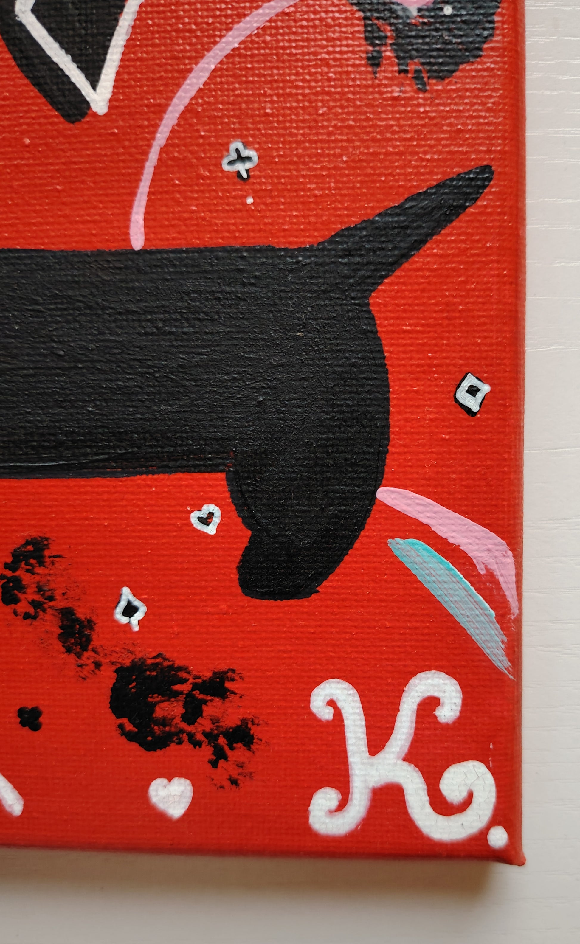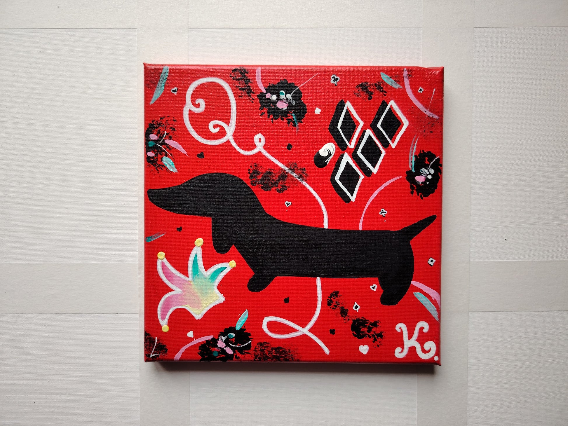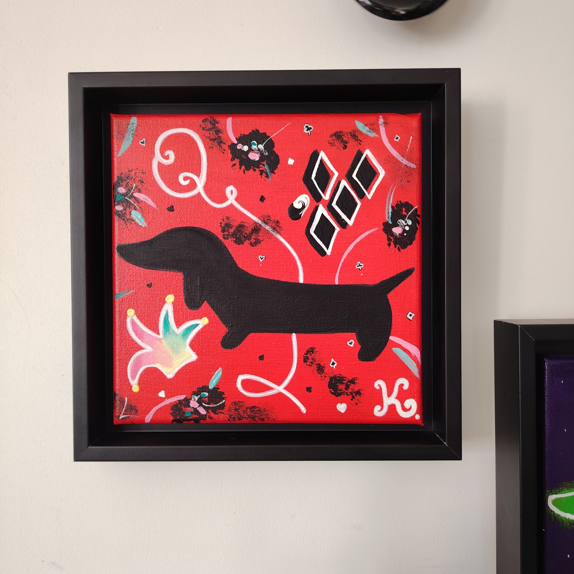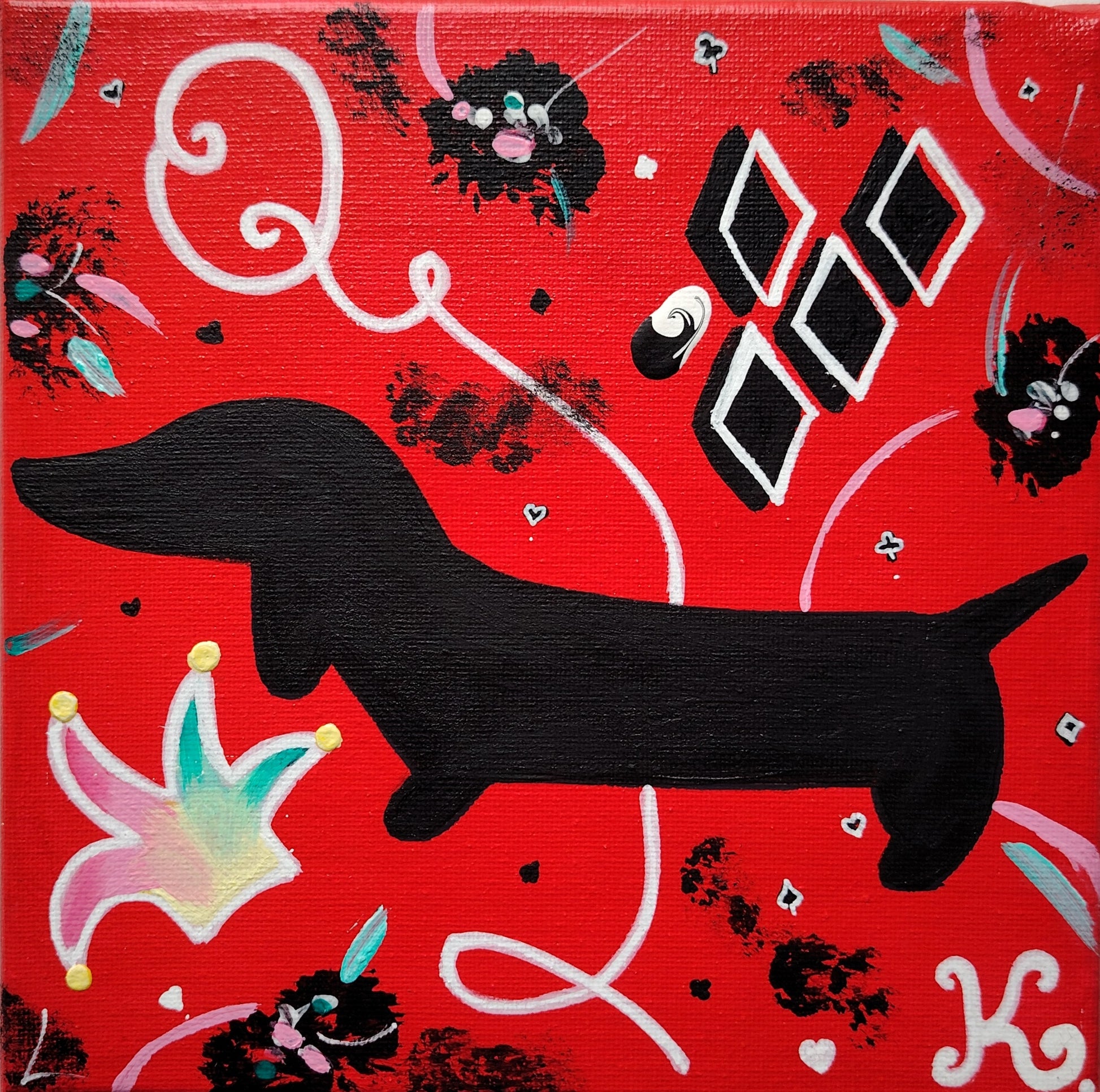 Pour en savoir plus sur les raisons profondes qui m'ont conduite à une telle énormité (à savoir mixer un honorable teckel avec l'inénarrable personnage Harley Quinn de la maison DC Comics), je vous invite à lire la description du tableau intitulé The Joker.