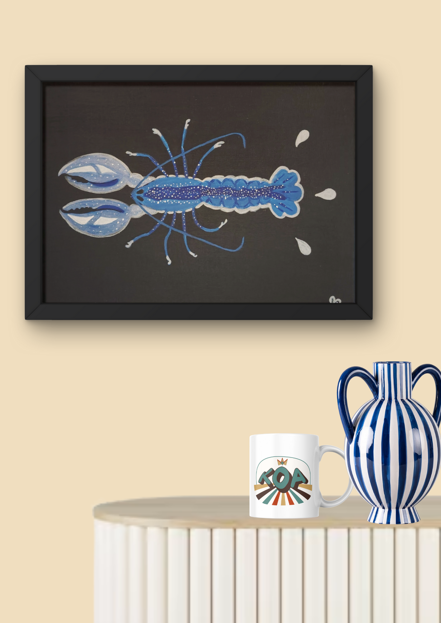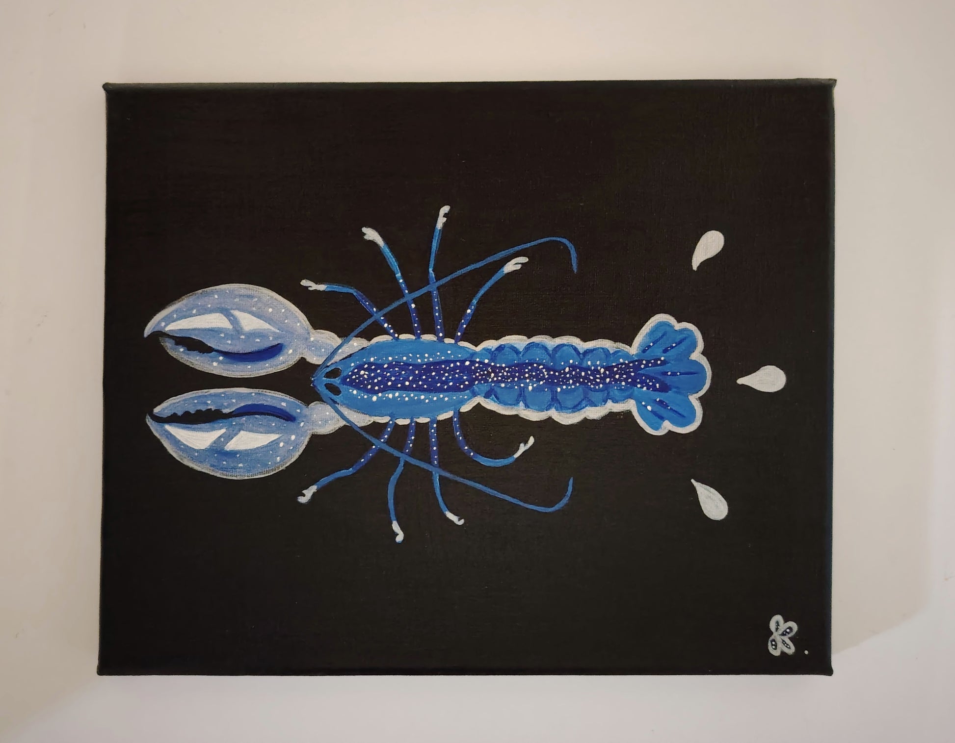 Trêve de plaisanteries ! Ce tableau est l'un de mes préférés. Le contraste bleu noir. La symbolique de ce crustacé carapaçonné, tendre et moelleux à l'intérieur, paré pour le combat à l'extérieur. Comme si la nature avait voulu lui donné un avantage.