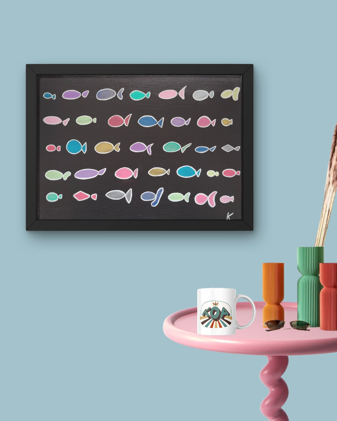 J'avais envie d'un tableau terriblement moderne, impitoyablement coloré. Cette ribambelle de poissons stylisée en est ressortie.